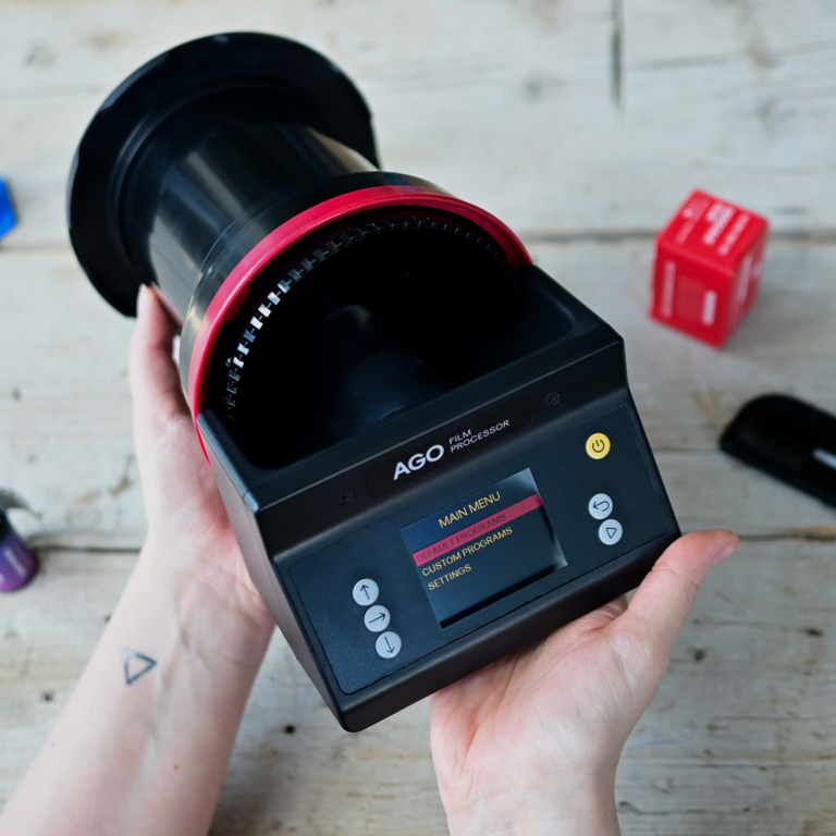 AGO works with Paterson Super System 4 tanks, so you can develop anywhere from 1 up to 8 rolls of 35mm at once. For 120 medium format, the tanks hold 1, 2, 3, 5, or 8 rolls depending on the tank size.